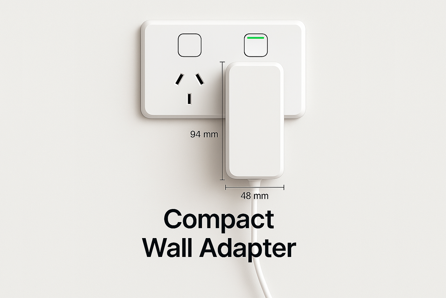 Compact white wall adapter — specifically designed to blend seamlessly with modern interiors, providing reliable power without being an eye-sore.