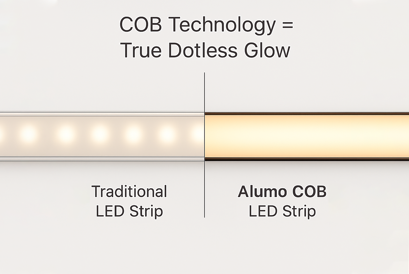 COB LED strips provide a smooth, dot-free glow compared to traditional LED strips — giving your space a premium, hotel-like finish.